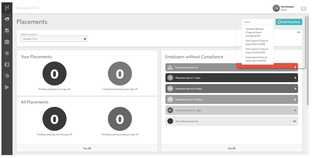 2. In the search bar on the top right of the page, search for the placement. You can do this by typing in the student name or the employer organisation name.