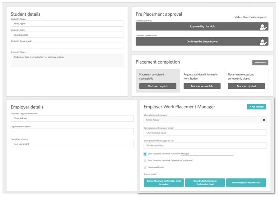 4. In the 'Employer Work Placement Manager' panel of the placement record, you will see 3 checkboxes, and 3 buttons that will allow you to control the automatic emails that are sent out from the platform.